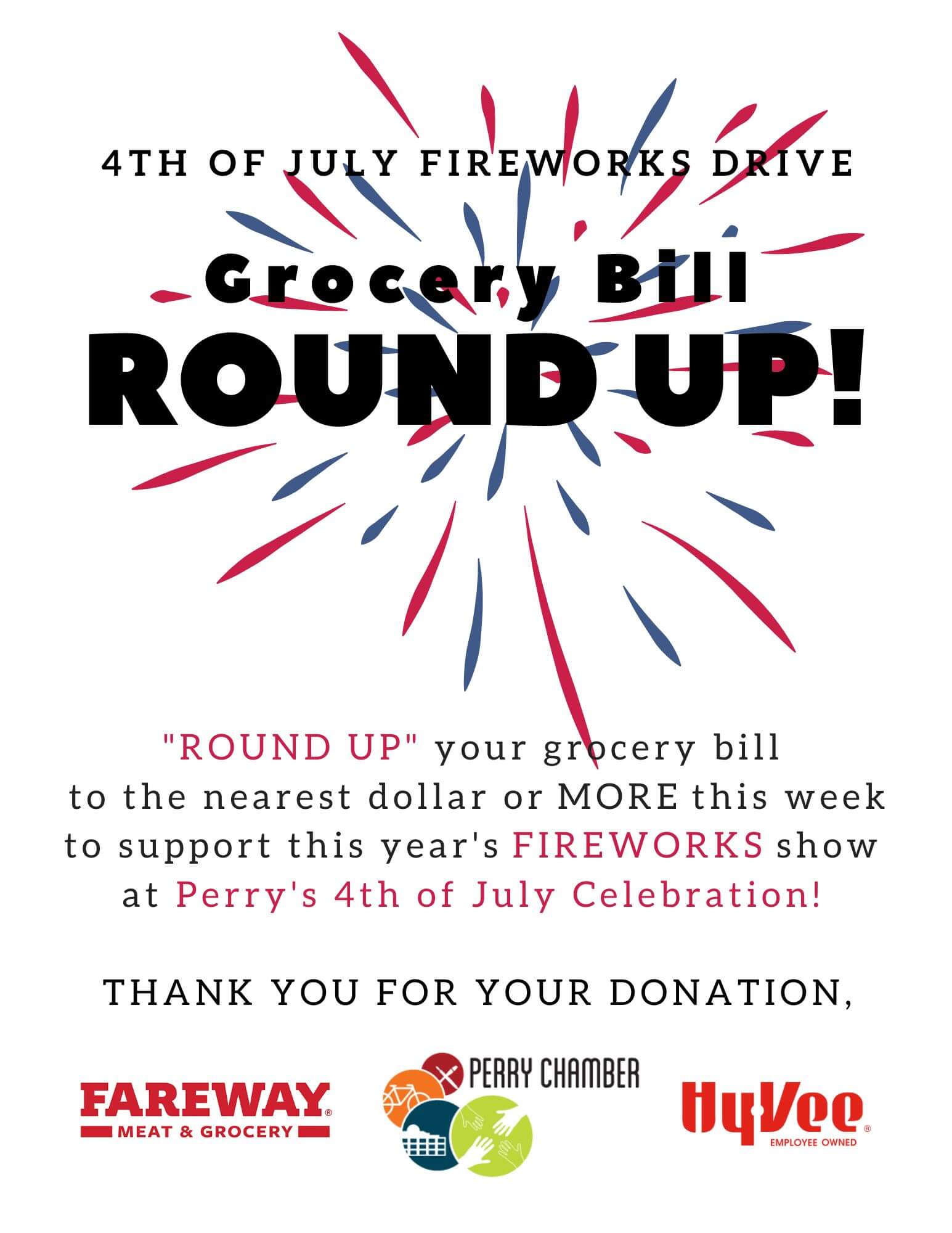 During the week leading up to Memorial Day, shoppers are asked to "round up at the register" at Perry's two largest grocery stores, Hy-vee and Fareway. Every little bit adds up in this friendly competition and fundraiser as shoppers round up their purchases to the nearest dollar or more to support the 4th of July fireworks drive.