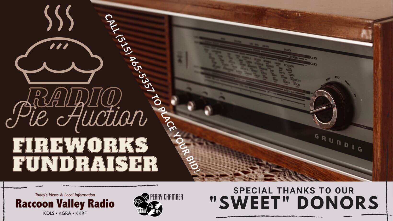 The Radio Pie Auction is just as it sounds... an auction of pies, live on the radio! However, with the intention of fundraising for Perry's 4th of July fireworks, "pie" sometimes means cakes, too!